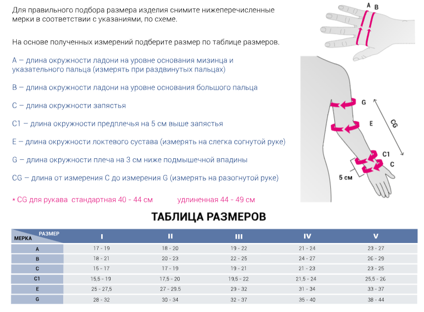 Рукав компрессионный medi Esprit 2 класс комбинированный удлиненный J26 medi Описание Рукав комбинированный  с резинкой на силиконовой основе удлиненный Класс компрессии: 2 класс 23-32 мм рт. ст. Длина (CG) удлиненная 44-48 см. mediven esprit - изделия 2-го класса компрессии предназначены для использования в тех случаях, когда необходим выраженный противоотечный эффект. Благодаря технологии плоской вязки лечебные рукава mediven esprit создают высокое рабочее давление, обладают повышенной прочностью и износоустойчивостью. Подбор размера Схема измерения a - окружность ладони на уровне оснований мизинца и указательного пальца; замеряется при раздвинутых пальцах.b - окружность ладони на уровне основания большого пальцаc - окружность запястьяc1 - окружность предплечья на 5 см выше запястьяe - окружность локтевого сустава; измеряется при слегка согнутой в локтевом суставе рукеg - окружность плеча на 3 см ниже подмышечной впадиныCG - длина измерения с до измерения g измеряется при разогнутой руке Таблица размеров J26tve /upload/iblock/b7c/b7c7d2079d421e5d5c616c9a44a27550.jpg